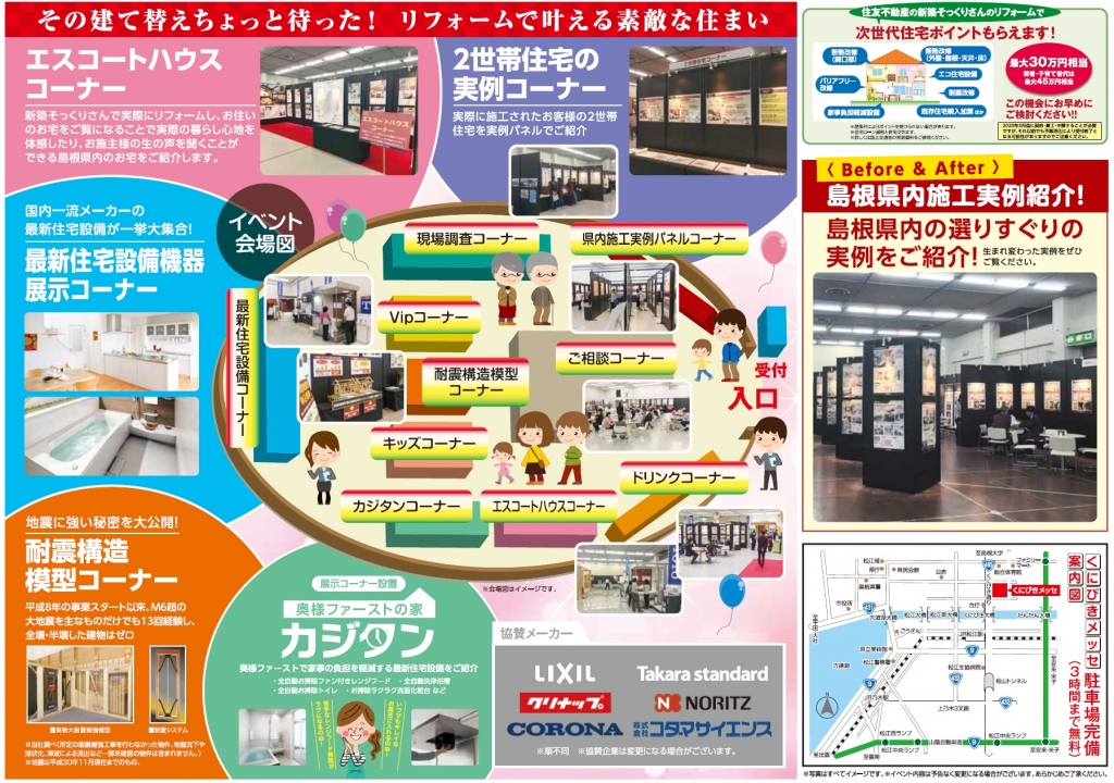 住宅のリフォームに関する相談会。ジャンル別のリフォームの実例、耐震模型や最新の住宅設備の展示を始め、各種セミナー、相談ブースなどを設置。二世帯住宅の実例パネルコーナーやキッズコーナーなどもあり、家族で出かけて、これからの我が家について考えてみては。予約不要だが、web予約で特典があるので、要チェックだ。
